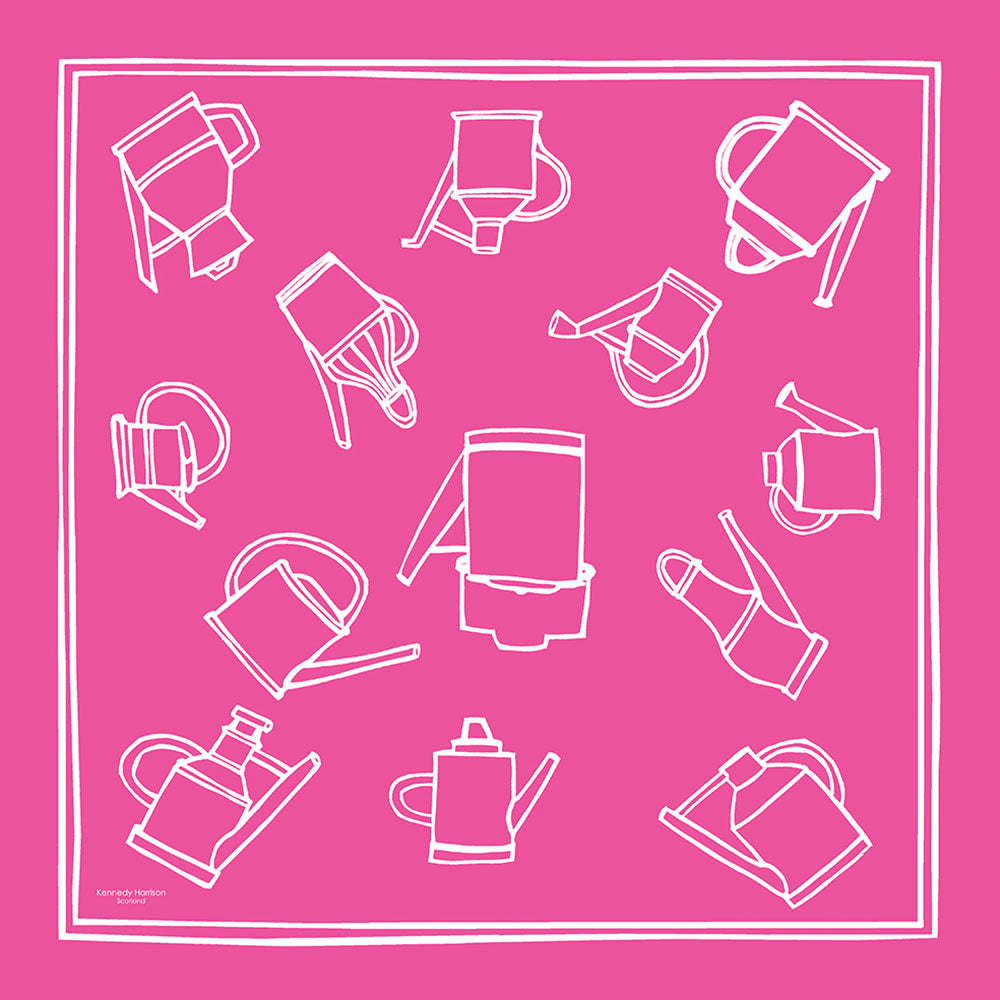 Designed by Penny Kennedy in her garden studio at Mouse Cottage. This design was inspired by Penny’s love of her garden, which has opened for the past two years under Scotland’s Garden Scheme, raising money for charity. The design reflects a brief history of watering can designs, classic, French, vintage and new – all timeless. Created first as a collage. A simple graphic style which reflects her earlier career in gift wrap and packaging.